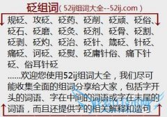 组词大全详解[砭组词]如:规砭、攻砭、砭药、砭削、砭顽、砭俗、砭石、砭磨、砭灸、砭剂、砭骨、砭割、砭剥、砭灼、砭治、砭针、箴砭、针砭、痛砭、诃砭、砭熨、砭庸...