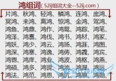 组词大全详解[鸿组词]如:片鸿、秋鸿、轻鸿、鳞鸿、连鸿、庞鸿、冥鸿、来鸿、离鸿、惊鸿、金鸿、驾鸿、鸿鱼、鸿鼎、鸿作、鸿鸳、鸿踪、鸿笔、鸿泽、鸿翥、鸿伐、鸿书...