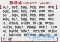 组词大全详解[枫组词]如:枫子、枫木、枫脂、枫落、枫林、枫墀、枫叟、枫宸、枫陛、丹枫、徐枫、枫实、枫叶、枫桥、青枫、枫香、枫锦、桠枫、霜枫、枫人、枫鬼、枫胶...
