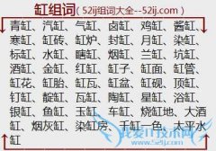 组词大全详解[缸组词]如:青缸、汽缸、气缸、卤缸、鸡缸、酱缸、寒缸、缸砖、缸炉、封缸、月缸、染缸、标缸、水缸、瞎缸、烟缸、兰缸、坑缸、酒缸、金缸、红缸、缸子...
