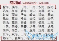 组词大全详解[岗组词]如:警岗、换岗、门岗、山岗、设岗、脱岗、站岗、在岗、转岗、岗尖、岗棚、岗卡、复岗、顶岗、待岗、岭岗、陵岗、灵岗、昆岗、竞岗、漫岗、岗位...