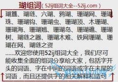 组词大全详解[瑚组词]如:瑚簋、瑚琏、六瑚、鸦瑚、珊瑚网、珊瑚珠、珊瑚钩、珊瑚虫、珊瑚顶、木珊瑚、珊瑚海、珊瑚翘、珊瑚岛、珊瑚礁、珊瑚树、瑚琏之器、珊瑚木难...