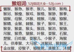 组词大全详解[猴组词]如:懒猴、猴急、猴枣、猴儿、猴栗、猴梅、猴冠、猴瘦、猴戏、猴楂、猴狲、猴拳、猫猴、母猴、沐猴、棉猴、马猴、猕猴、猴精、金猴、棘猴、猴子...