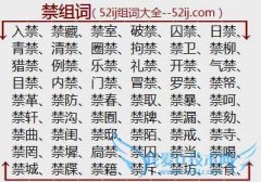 组词大全详解[禁组词]如:入禁、禁藏、禁室、破禁、囚禁、日禁、青禁、清禁、圈禁、拘禁、禁卫、禁柳、猎禁、例禁、乐禁、礼禁、开禁、气禁、目禁、内禁、门禁、冒禁...