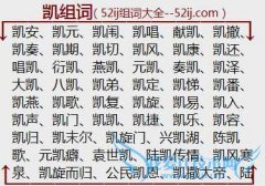 组词大全详解[凯组词]如:凯安、凯元、凯闱、凯唱、献凯、凯撤、凯奏、凯期、凯切、凯风、凯康、凯还、唱凯、衍凯、燕凯、元凯、奏凯、凯泽、大凯、八凯、凯弟、凯定...