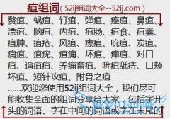 组词大全详解[疽组词]如:赘疽、蜗疽、钉疽、弹疽、痤疽、鼻疽、漂疽、脑疽、内疽、疽肠、疽食、疽囊、疽肿、疽疮、风疽、瘭疽、吮疽、炭疽、痈疽、疽疣、疽痈、坏疽...