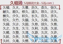 组词大全详解[久组词]如:久稽、久大、久慕、历久、柰久、弥久、耐久、遐久、修久、遥久、悠久、迂久、弊久、少久、积久、长久、亘久、多久、经久、久竹、久锢、久久...
