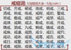 组词大全详解[戒组词]如:切戒、齐戒、破戒、南戒、明戒、三戒、清戒、前戒、练戒、戒程、戒劝、警戒、禁戒、儆戒、戒指、戒严、戒禁、戒品、戒律、戒期、戒法、勒戒...