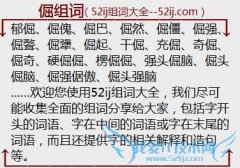 组词大全详解[倔组词]如:郁倔、倔傀、倔巴、倔然、倔僵、倔强、倔聱、倔犟、倔起、干倔、充倔、奇倔、倔奇、硬倔倔、楞倔倔、强头倔脑、倔头倔脑、倔强倨傲、倔头强...