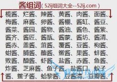 组词大全详解[酱组词]如:榄酱、烂酱、辣酱、黄酱、肉酱、面酱、梅酱、麻酱、卵酱、酱棚、酱缸、酱豆、酱菜、酱园、酱物、酱油、酱色、酱紫、酱齐、酱匠、酱瓿、酱蒙...