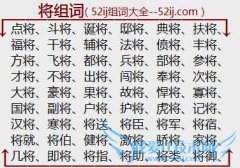组词大全详解[将组词]如:点将、斗将、诞将、邸将、典将、扶将、福将、干将、辅将、法将、偾将、丰将、方将、飞将、都将、兵将、部将、参将、才将、不将、出将、闯将...