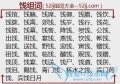 组词大全详解[饯组词]如:饯馆、饯觞、饯席、饯御、饯腊、饯饮、饯筵、饯离、郊饯、饯岁、饯行、饯花、饯路、饯幕、饯客、降饯、贺饯、公饯、出饯、班饯、宴饯、燕饯...