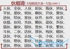 组词大全详解[伙组词]如:入伙、全伙、人伙、起伙、瓶伙、拼伙、平伙、朋伙、明伙、喇伙、开伙、聚伙、进伙、结伙、家伙、伙并、伙伴、伙多、伙烦、伙同、充伙、稠伙...
