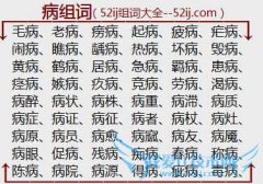 组词大全详解[病组词]如:毛病、老病、痨病、起病、疲病、疟病、闹病、瞧病、龋病、热病、坏病、毁病、黄病、鹤病、居病、急病、羁病、患病、痉病、嫉病、疚病、竞病...