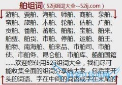 组词大全详解[舶组词]如:游舶、贾舶、海舶、师舶、商舶、泉舶、蛮舶、旅舶、木舶、轮舶、估舶、广舶、贡舶、番舶、蕃舶、舶船、宝舶、舶来、舶贾、舶货、市舶、停舶...
