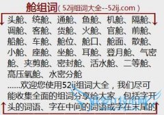 组词大全详解[舱组词]如:头舱、统舱、通舱、鱼舱、机舱、隔舱、调舱、客舱、货舱、火舱、官舱、前舱、船舱、车舱、舱位、舱口、舱面、散舱、小舱、座舱、坐舱、耳舱...