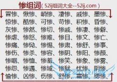 组词大全详解[惨组词]如:冒惨、愀惨、峭惨、凄惨、戚惨、墨惨、惊惨、酷惨、可惨、苛惨、积惨、昏惨、灰惨、惨然、惨切、惨戚、惨凄、惨僻、惨虐、惨怒、惨难、惨目...
