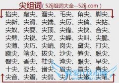 组词大全详解[尖组词]如:掐尖、敲尖、溜尖、毛尖、角尖、脚尖、尖新、尖滑、尖端、尖厉、尖俏、尖站、尖奴、尖耍、尖顶、尖锋、尖快、合尖、尖劈、尖锐、尖叉、尖峰...