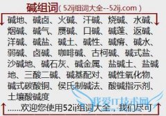 组词大全详解[碱组词]如:碱地、碱卤、火碱、汗碱、烧碱、水碱、烟碱、碱气、赝碱、口碱、碱蓬、返碱、洋碱、碱盐、碱土、碱性、碱瘠、碱水、弱碱、卤碱、咖啡碱、古...