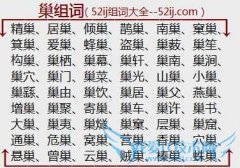 组词大全详解[巢组词]如:精巢、居巢、倾巢、鹊巢、南巢、窠巢、箕巢、爱巢、蜂巢、盗巢、巢薮、巢笙、构巢、巢栖、巢幕、巢轩、巢南、巢涧、巢穴、巢门、巢菜、巢光...