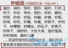 组词大全详解[吵组词]如:鬼吵、闹吵、惊吵、聒吵、鼓吵、打吵、吵子、吵仗、争吵、相吵、吵吵、厮吵、吵架、吵房、吵烦、吵翻、吵喜、吵聒、吵闹、吵扰、吵嚷、吵嘴...