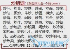 组词大全详解[炒组词]如:炒肝、炒青、炒铁、炒闹、炒面、炒米、炒勺、厮炒、斗炒、炒团、棋炒、热炒、炒锅、炒卖、闹炒、炒刺、炒金、炒咬、炒聒、炒作、炒货、炒戚...