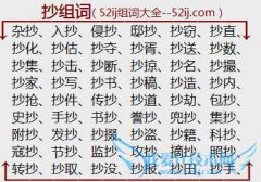 组词大全详解[抄组词]如:杂抄、入抄、侵抄、邸抄、抄窃、抄直、抄化、抄估、抄夺、抄胥、抄送、抄数、抄集、抄击、抄断、抄掠、抄名、抄撮、抄家、抄写、抄书、抄稿...