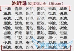 组词大全详解[池组词]如:上池、青池、污池、舞池、香池、星池、熏池、液池、瑶池、血池、盐池、研池、晕池、云池、月池、珍池、中池、周池、重池、鸳池、鱼池、雁池...