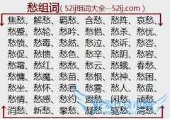 组词大全详解[愁组词]如:焦愁、解愁、羁愁、含愁、愁阵、哀愁、愁蹙、愁轮、愁吟、愁悒、愁杀、愁忧、愁愤、愁毒、愁然、愁泣、愁诉、愁咨、愁促、愁愦、愁色、愁辛...