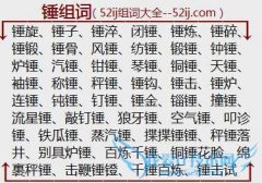 组词大全详解[锤组词]如:锤旋、锤子、锤淬、闭锤、锤炼、锤碎、锤锻、锤骨、风锤、纺锤、锻锤、钟锤、炉锤、汽锤、钳锤、琴锤、铜锤、天锤、袖锤、称锤、秤锤、锤钩...