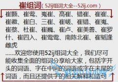 组词大全详解[崔组词]如:崔颢、崔莺、嵬崔、高崔、错崔、崔崔、崔徽、崔白、三崔、崔嵯、崔错、崔嵬、崔蔡、杜崔、崔巍、崔卢、崔美善、崔罗什、崔四入、崔莺莺、南...