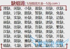 组词大全详解[缺组词]如:湮缺、闲缺、小缺、盈缺、员缺、优缺、损缺、讨缺、题缺、暂缺、隙缺、兔缺、亡缺、实缺、补缺、剥缺、本缺、边缺、崩缺、裁缺、散缺、瘦缺...