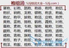 组词大全详解[袍组词]如:罩袍、衫袍、鹊袍、袍褂、袍绔、袍铠、袍袄、衲袍、龙袍、蟒袍、袍表、袍袖、袍仗、袍甲、披袍、袍领、皮袍、袍界、黄袍、蓝袍、锦袍、鹤袍...