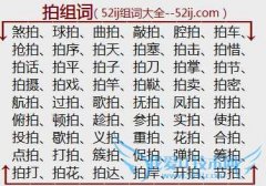 组词大全详解[拍组词]如:煞拍、球拍、曲拍、敲拍、腔拍、拍车、抢拍、拍序、拍天、拍塞、拍击、拍惜、拍话、拍平、拍子、拍刀、拍掌、拍节、拍摄、拍戏、拍竿、拍鞑...