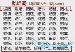 组词大全详解[赔组词]如:通赔、退赔、赔笑、赔钞、赔桩、赔礼、赔填、赔房、赔还、赔钱、赔饷、赔帐、赔费、赔话、理赔、倒赔、索赔、赔送、赔垫、赔产、认赔、赔累...