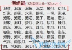 组词大全详解[泡组词]如:泡茶、泡漩、泡鱼、泡货、燎泡、幻泡、灯泡、起泡、水泡、眼泡、一泡、泡澡、泡汤、泡泡、泡妞、泡子、泡菜、泡沫、泡饭、泡灯、梦泡、沤泡...