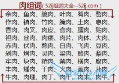 组词大全详解[肉组词]如:余肉、鱼肉、臆肉、叶肉、肴肉、赘肉、作肉、镇肉、竹肉、腌肉、土肉、息肉、香肉、肉叉、肉皮、食肉、膻肉、贴肉、袒肉、丝肉、肉痿、肉片...