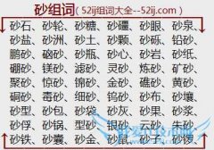组词大全详解[砂组词]如:砂石、砂轮、砂糖、砂礓、砂眼、砂泉、砂盐、砂洲、砂土、砂颗、砂砾、铅砂、鹏砂、硇砂、砂瓶、砂心、砂岩、砂纸、硼砂、镁砂、滤砂、灵砂...