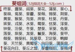 组词大全详解[葵组词]如:终葵、露葵、闾葵、葵花、蒲葵、葵心、葵扇、菟葵、葵藿、葵倾、锦葵、荆葵、黄葵、猴葵、凫葵、房葵、杜葵、丹葵、拔葵、戎葵、水葵、蜀葵...