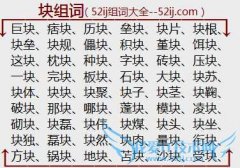组词大全详解[块组词]如:巨块、痞块、历块、垒块、块片、块根、块垒、块规、儡块、积块、堇块、饵块、这块、枕块、种块、字块、砖块、压块、一块、完块、板块、石块...