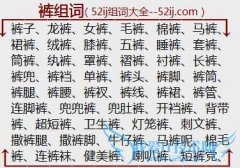 组词大全详解[裤组词]如:裤子、龙裤、女裤、毛裤、棉裤、马裤、裙裤、绒裤、膝裤、五裤、睡裤、套裤、筒裤、纨裤、罩裤、褶裤、衬裤、长裤、裤兜、裤裆、单裤、裤头...
