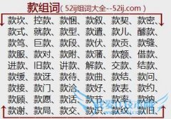组词大全详解[款组词]如:款坎、控款、款悃、款叙、款契、款密、款式、就款、款型、款遣、款儿、醵款、款笃、巨款、款段、款伏、款贡、款缝、款服、款对、款附、款藩...