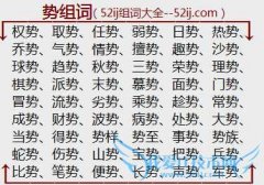 组词大全详解[势组词]如:权势、取势、任势、弱势、日势、热势、乔势、气势、情势、擅势、趣势、沙势、球势、趋势、秋势、三势、荣势、理势、棋势、派势、末势、慕势...