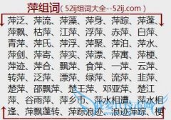 组词大全详解[萍组词]如:萍泛、萍流、萍藻、萍身、萍踪、萍蓬、萍飘、枯萍、江萍、浮萍、赤萍、白萍、青萍、萍氏、萍浮、萍聚、萍泊、萍水、萍剑、萍寄、萍实、萍漂...