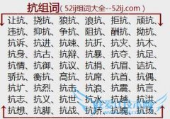 组词大全详解[抗组词]如:让抗、挠抗、狼抗、浪抗、拒抗、顽抗、违抗、抑抗、争抗、阻抗、酬抗、拗抗、抗诉、抗进、抗竦、抗折、抗灾、抗木、抗身、抗古、抗辩、抗暴...