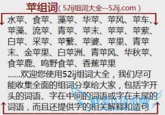组词大全详解[苹组词]如:水苹、食苹、藻苹、华苹、苹风、苹车、苹藻、流苹、青苹、苹末、苹苹、苹萦、白苹、采苹、苹蘩、苹婆、苹果、青苹末、金苹果、白苹洲、青苹...