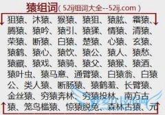 组词大全详解[猿组词]如:狙猿、沐猿、猴猿、猿狙、猿肱、霜猿、腾猿、猿吟、猿引、猿猱、情猿、清猿、荣猿、断猿、白猿、楚猿、心猿、玄猿、猿鹤、猿心、猿饮、猿公...