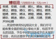 组词大全详解[赙组词]如:赉赙、祭赙、合赙、赙礼、赙施、赙金、赙送、赙恤、赙仪、赙马、赙钱、赙赉、赠赙、赙祭、赙诔、赙赠、赙赐、赙布、赙助、赙遗、赙补、法赙...
