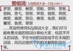 组词大全详解[罟组词]如:罗罟、撩罟、鲸罟、罟船、罟师、罟客、罟网、罟弋、罟罟、罘罟、弛罟、罔罟、微罟、渔罟、罟目、兽罟、兔罟、网罟、罾罟、鱼罟、罪罟 另外...