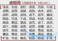 组词大全详解[卤组词]如:泽卤、走卤、卤灶、卤壶、泻卤、行卤、卤剽、卤莽、卤脉、卤拙、卤水、卤缸、卤虾、卤舄、卤钝、卤子、卤夺、碱卤、刚卤、甘卤、干卤、俘卤...